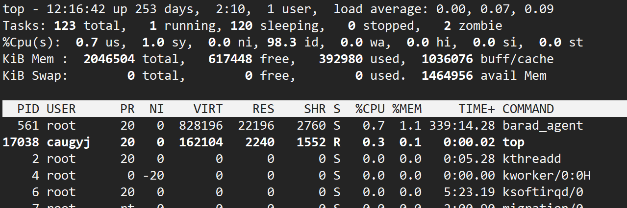 这张图里有很多信息,暂时先看一看后面分析,第二行:123total代表一共123个进程,1running代表一个在运行,120sleeping代表120个在阻塞等等,这代表进程是有状态的,不一定一直在运行。