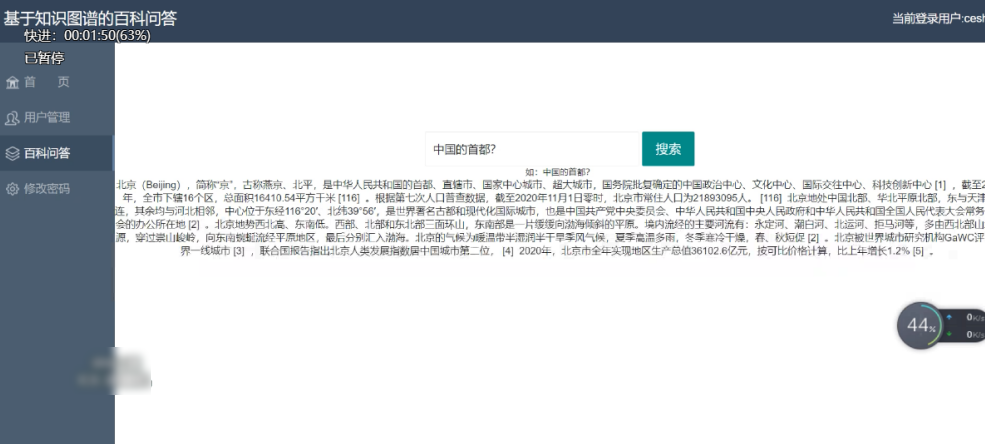 当点击搜索后,系统会自动的进行数据的爬取工作,需要有一段等待的时间,在等待之后搜索栏的下方会给出具体的问题答案,对中国的首都北京进行详细的内容解释,而本次的问答并不是简单的回复中国的首都是北京,而是更加深入的通过百科知识的爬取来对北京的历史名称、地理方位、气候条件等均进行了深入详细的解释工作