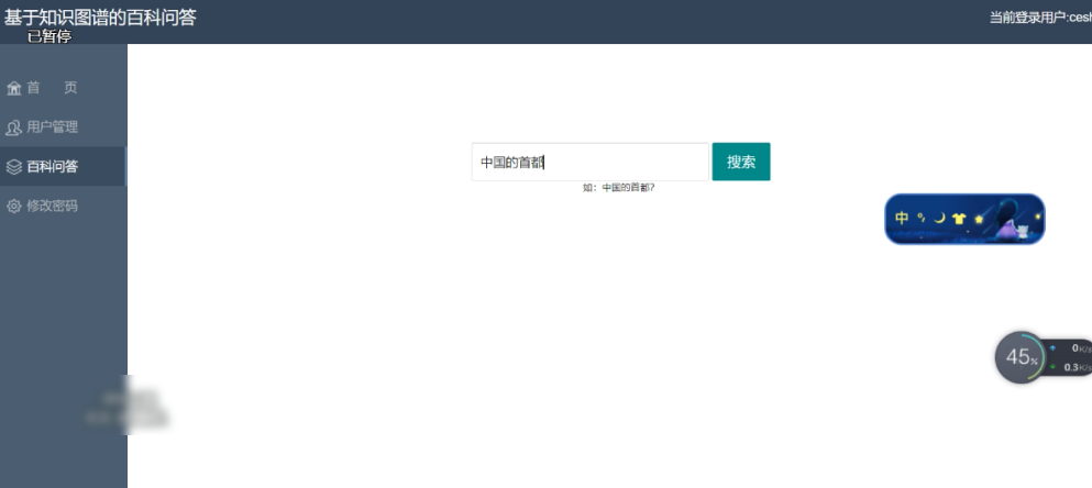 当进入到百科问答的功能模块中,可以在右侧主页的搜索栏中进行提问,例如下图中询问"中国的首都"点击搜索,系统将会自动进行答案的爬取工作