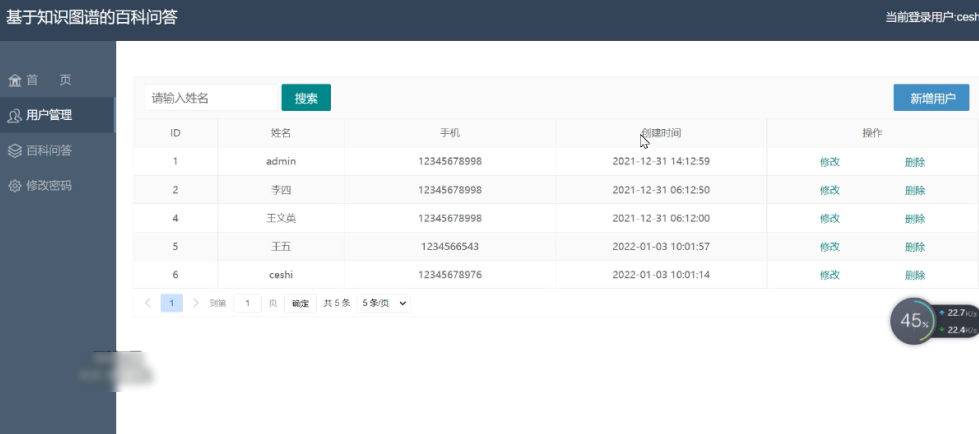问答平台的系统首页中可以看到系统中的功能模块主要是为百科问答所服务,其主要的功能模块有用户管理、百科问答以及密码的修改。功能十分的简单,以管理员的权限来看,可以看到所有的该平台注册用户的信息,可以对平台内的注册用户信息进行修改维护或者可以对一些违规的账号进行删除操作。