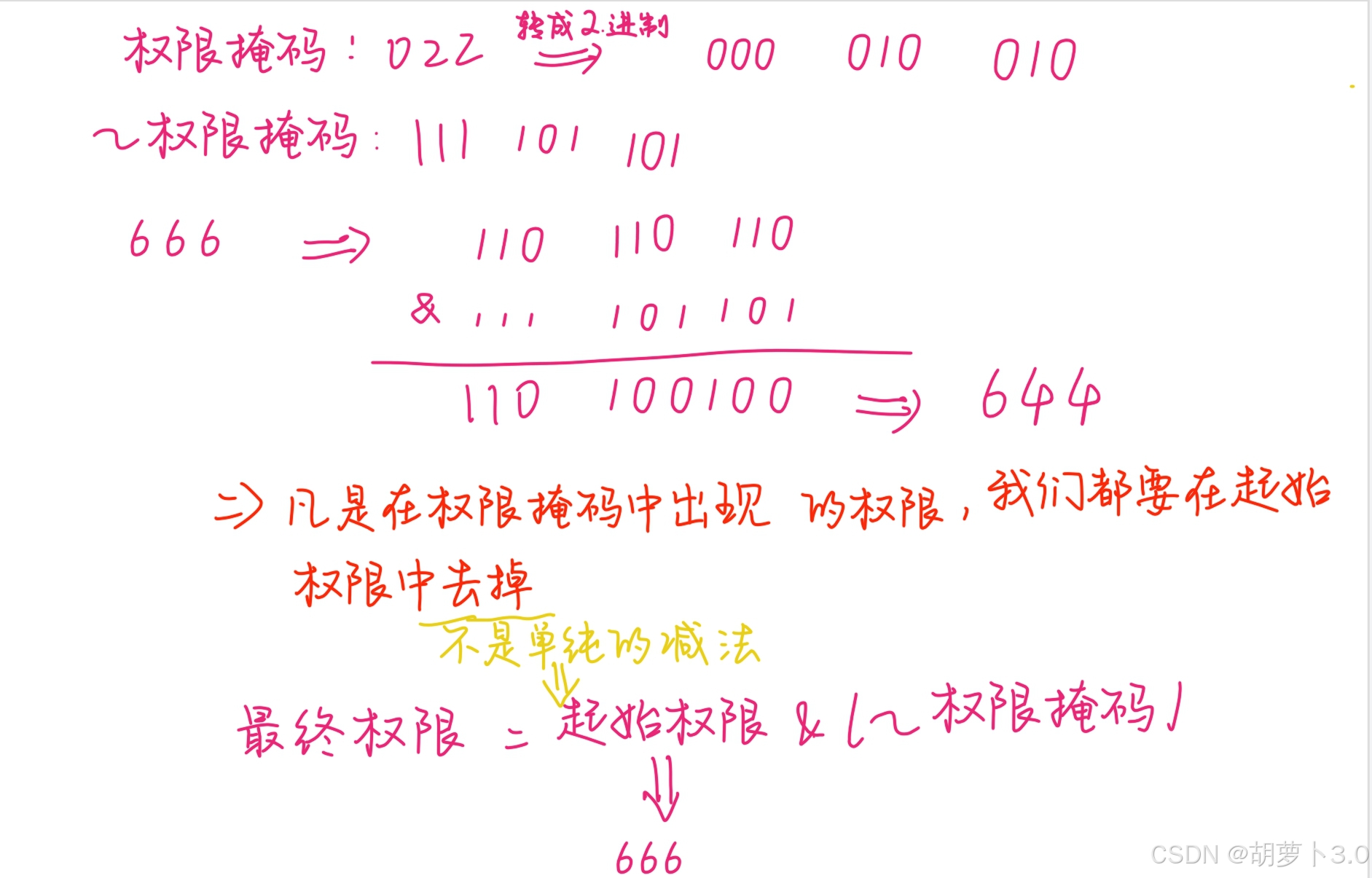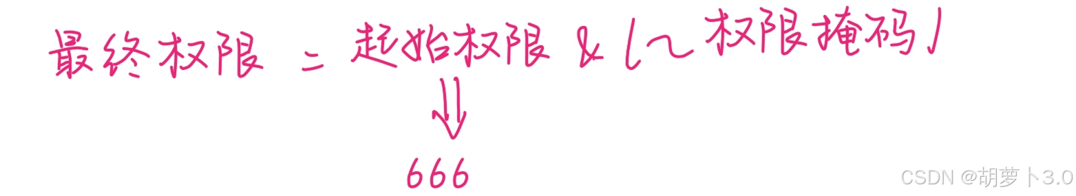 比如:如果权限掩码中的other位 w 权限为1,那么我们就要在起始权限中将other位的 w 权限去掉