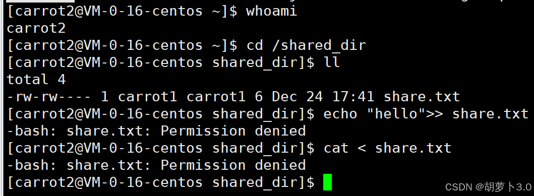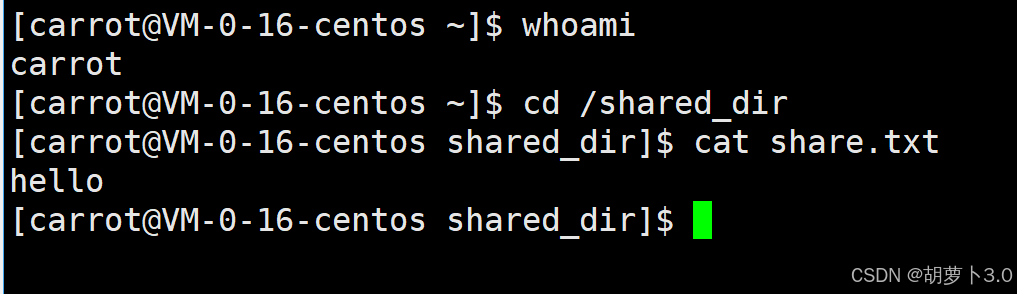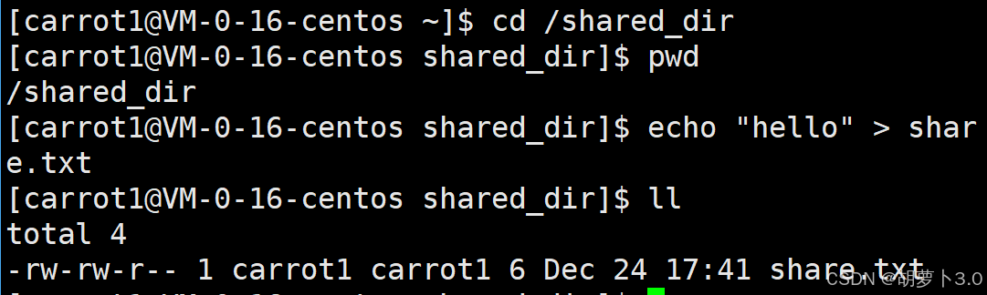 - 然后我们使用carrot1普通账号在/shared_dir目录中新建一个共享文件: