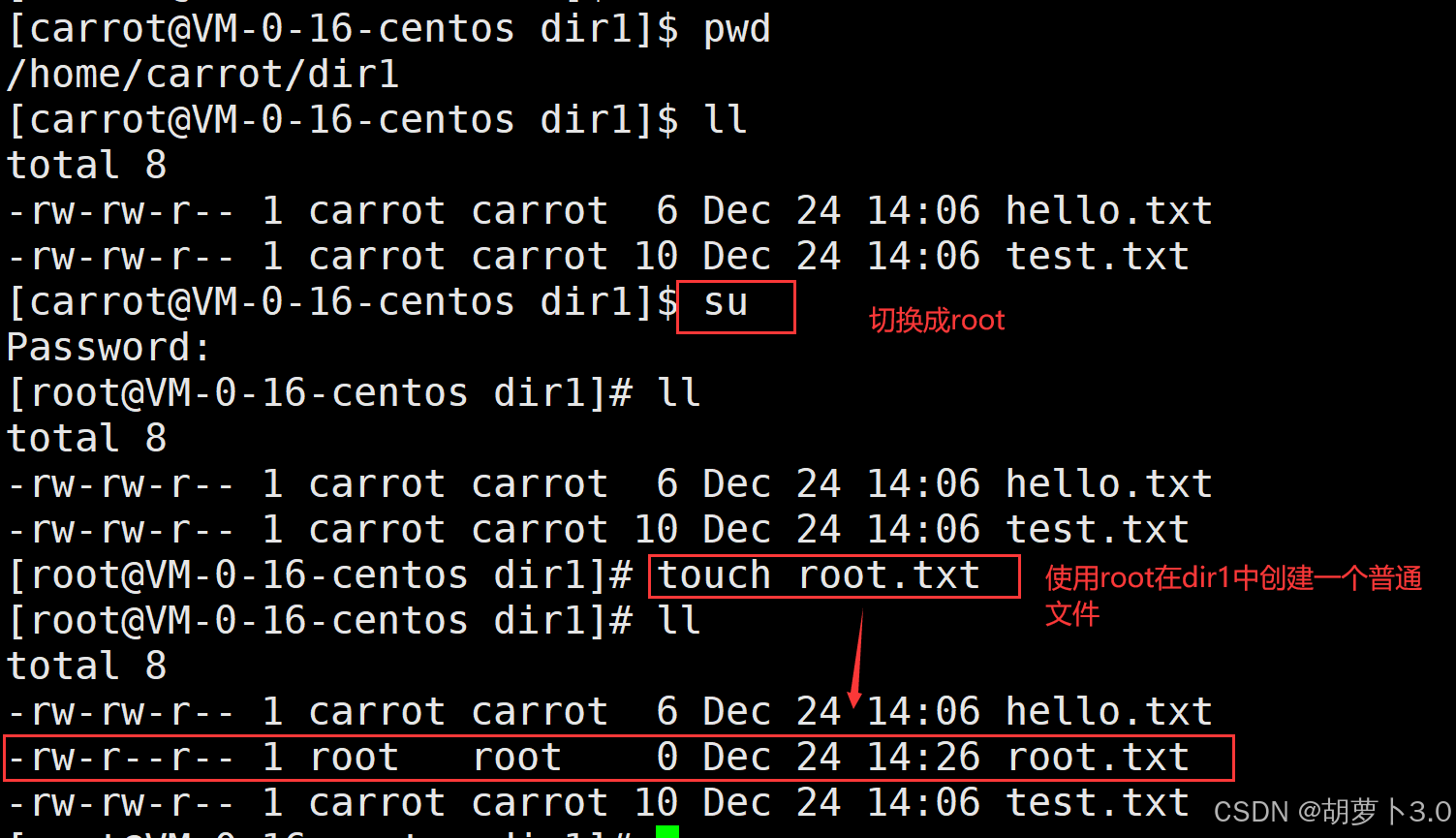 此时我在拥有者是carrot(普通用户),所属组是carrot(普通用户)的dir1目录中,用root权限创建一个拥有者是root,所属组是root的普通文件------