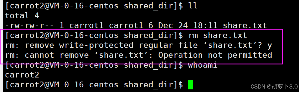 共享文件的拥有者是carrtto1,文件只能carrot1自己来删,这就是粘滞位的!!!