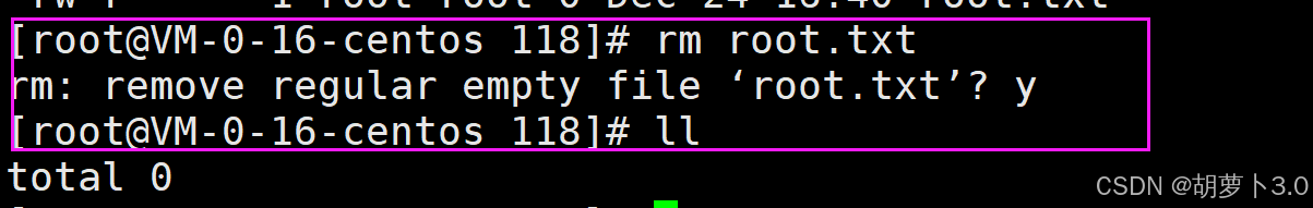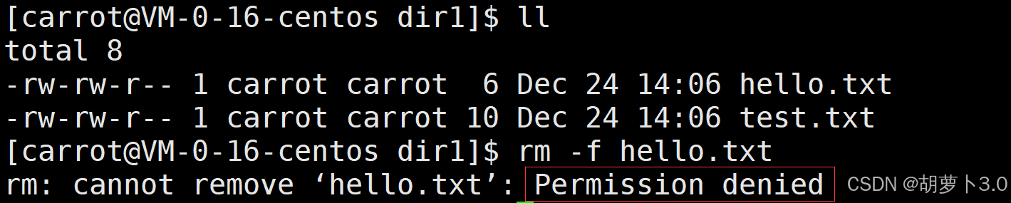 我现在作为一个普通用户(carrot),对于该root.txt文件不能读、不能写、不能执行,那我直接删除这个文件------