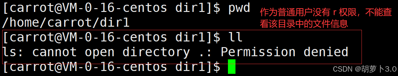 [carrot@VM-0-16-centos ~]$ chmod u-r dir1