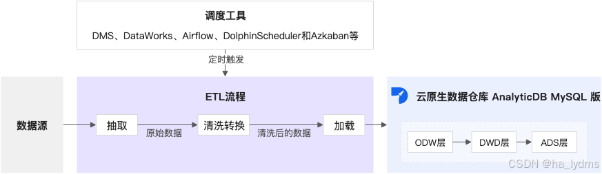 从数据源抽取数据,并经过清洗转换后,加载到AnalyticDB for MySQL。通过调度工具(DMS、DataWorks、Airflow、DolphinScheduler和Azkaban等)实现周期性ETL处理。