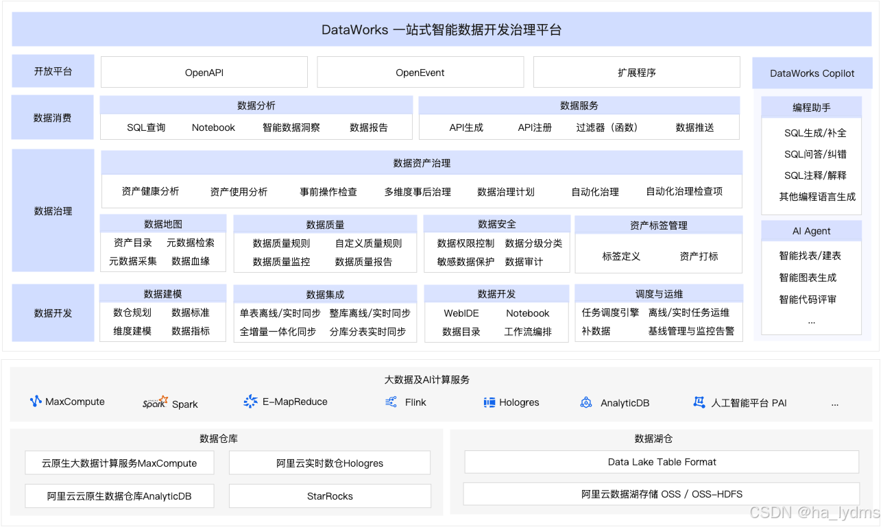 DataWorks是一站式智能大数据开发治理平台,适配阿里云MaxCompute、E-MapReduce、Hologres、Flink、AnalyticDB、StarRocks、PAI 等数十种大数据和AI计算服务,为数据仓库、数据湖、湖仓一体、Data+AI解决方案提供全链路智能化的数据集成、大数据AI一体化开发、数据分析与主动式数据资产治理服务,帮助企业进行全生命周期数据管理。自2009年以来,DataWorks以阿里巴巴集团大数据建设方法论为基础,不断沉淀数据治理最佳实践,现已广泛应用于包括政务、金融、零售、互联网、汽车、制造等众多行业,数以万计的客户信赖并选择DataWorks进行数字化升级和价值创造。