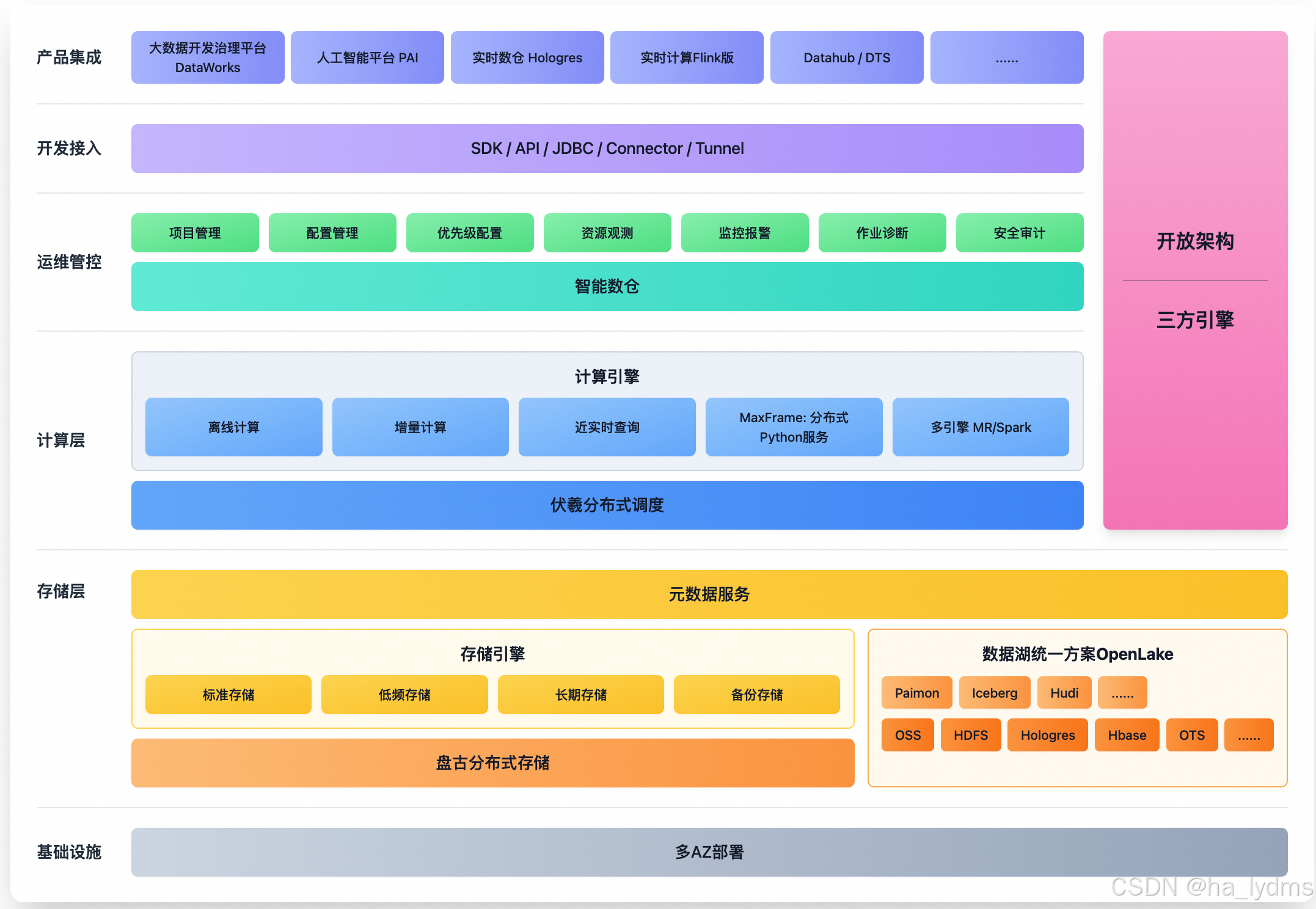 - 存储层通过其存储引擎,整合了由标准、低频、长期等存储类型构成的原生存储体系,并支持开放的湖仓一体(OpenLake)架构。