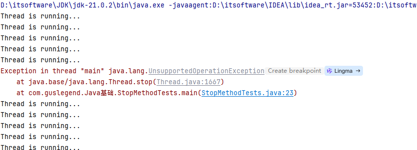 使用stop()方法强行终止线程,但是不推荐使用这个方法,该方法已被弃用;