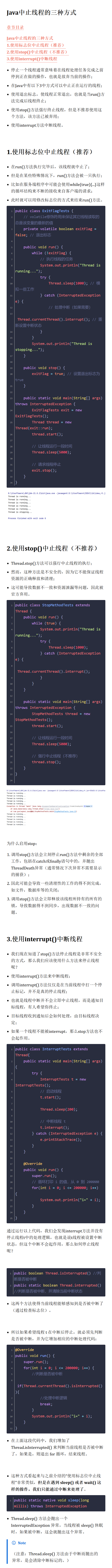 这种方式看起来与之前介绍的"使用标志位中止线程"非常类似,但是在遇到 sleep() 或者 wait() 这样的操作,我们只能通过中断来处理了。