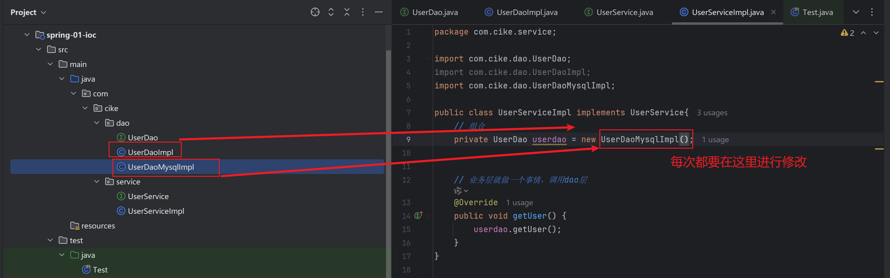 UserServiceImpl userService = new new UserDaoMysqlImpl();