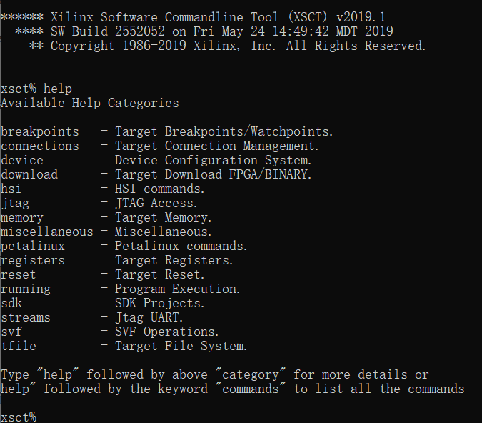 在命令行中运行 XSCT 可进入其交互式环境,例如: