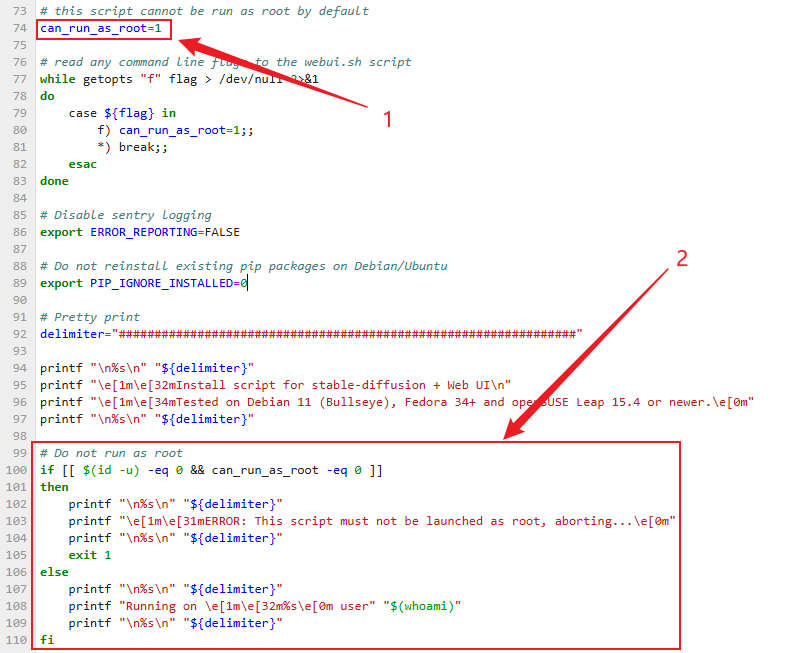 webui.sh文件中默认设置不可使用root用户启动项目,这个是为了安全考虑,可以创建一个新用户来启动项目。个人使用的话,最直接的解决方案就是,把1处的can_run_as_root=0改成1,或者注释2处的"Do not run as root"这块的脚本