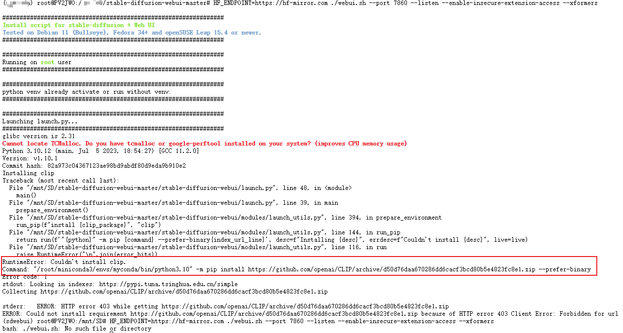 对于CLIP 包和pytoch安装失败的问题,可能是github下载时网络太慢,可以添加代理,在modules/launch_utils.py中的所有https://github.com/xxx.git 前面加 https://mirror.ghproxy.com/
