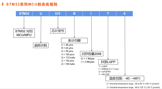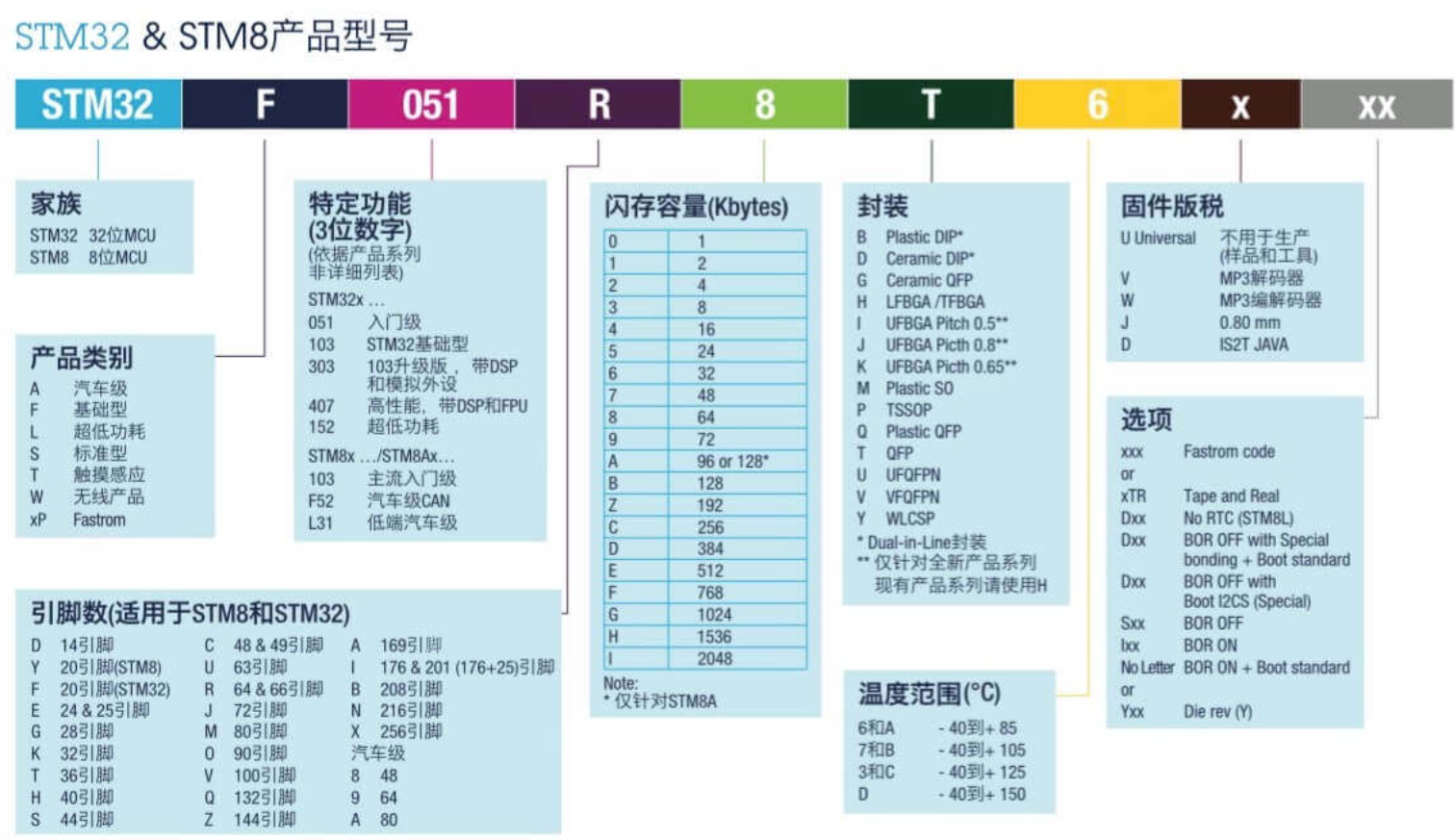芯片型号的命名,一般由"STM32"+产品类型+子系列代码+具体型号构成.