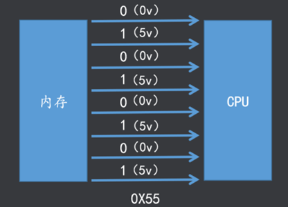 在计算机中数据的存储、传输、运算都是以二进制形式进行的,二进制的取值为0和1。数据的传输通过总线真正传递的是电信号,本质是高低电平的切换,如: