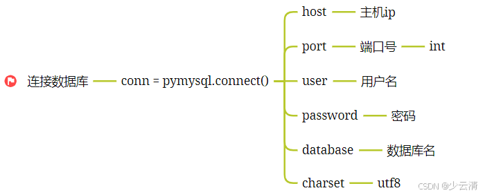 conn = pymysql.connect(host="", port=0, user="", password="", database="", charset="")