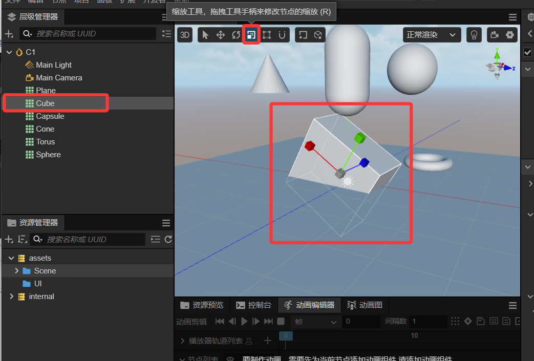 - 选中立方体,选中伸缩模式,沿着某个伸缩方向左右拖动