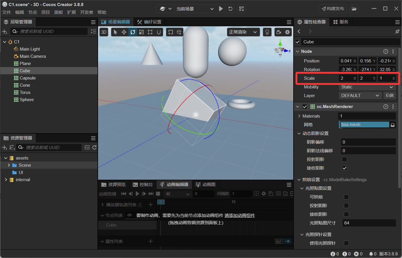 - 选中立方体,在属性编辑器里输入伸缩变换的参数