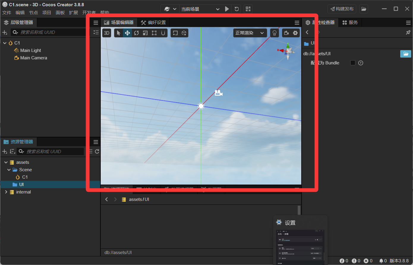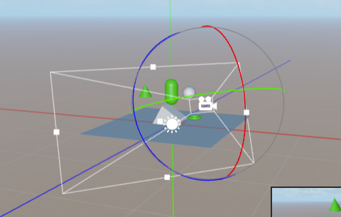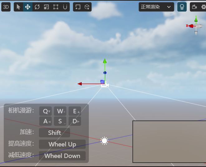 顾名思义,用来设计我们游戏里面的场景,红线对应 x 轴左右方向,蓝线对应 z 轴前后方向,绿线对应 y 轴上下方向)