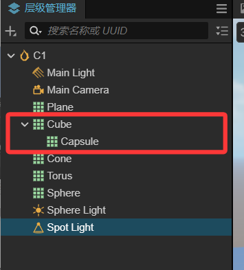 假如我想让capsule成为Cube的子节点,那我直接在层级管理器中拖动cube目录项,拖到Cube目录项位置处就行