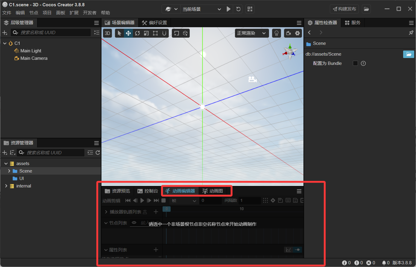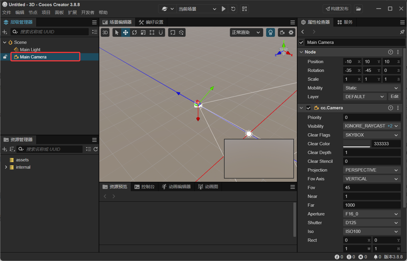 默认节点有两个,一个是Main Light (光源节点),另一个是Main Camera (摄像机节点)
