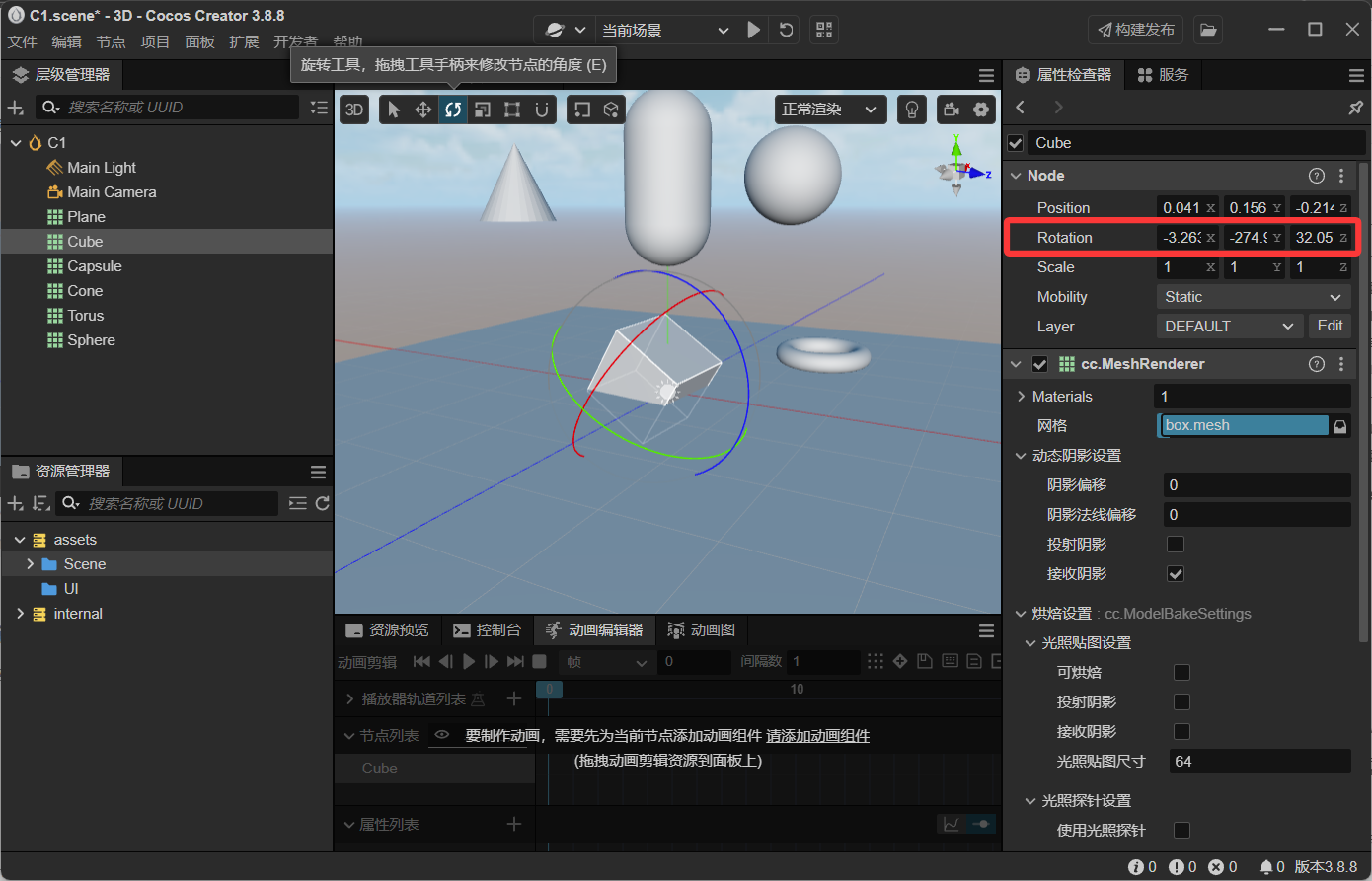 - 选中立方体,在属性编辑器里输入旋转参数