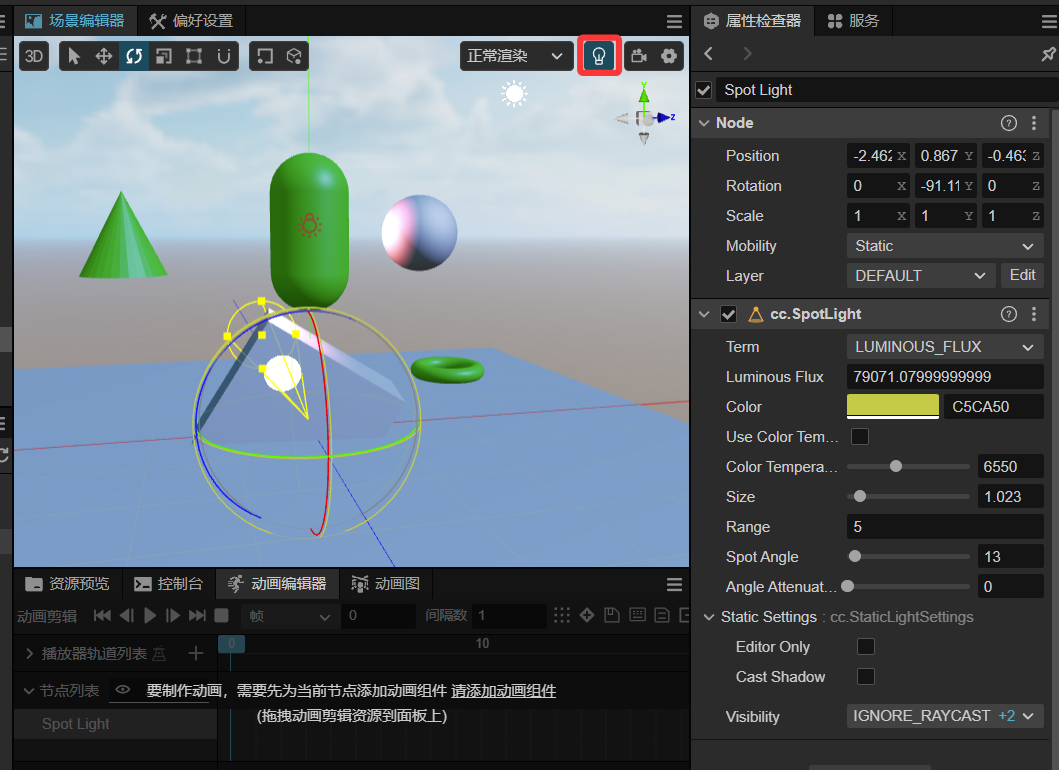 值得注意的是,你要是想实时在场景编辑器上查看光源效果,你必须得把右上角的点光源图标点亮
