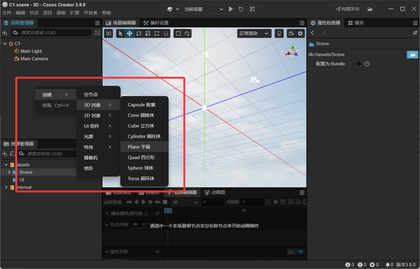 首先在层级管理器内空白处单击右键,创建一个平面