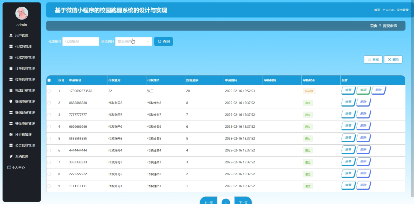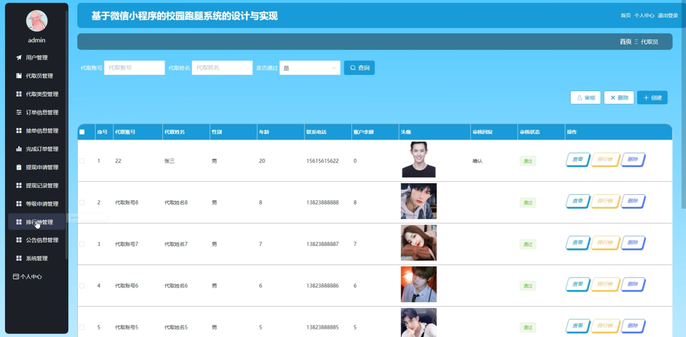 - 其他:提现申请审核与记录管理、代取员等级申请审核、排行榜管理、公告发布、系统管理、个人中心查看。