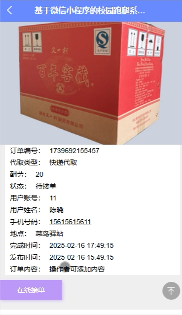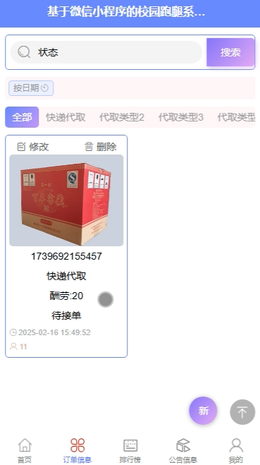 校园内学生对代取快递、代购商品、代办事务等跑腿服务需求日益多元化,但传统模式存在信息不透明(依赖线下传播,信息不对称)、服务效率低(供需对接不畅)、管理难度大(人工统计,难掌握整体运行状况)等问题。现有校园服务平台多功能单一、界面不友好、数据安全有隐患,无法满足需求。随着移动互联网发展及学生对服务品质要求提升,依托微信小程序轻量化、便捷化优势,结合后端技术开发校园跑腿系统,实现数字化管理,成为智慧校园建设的迫切需求。