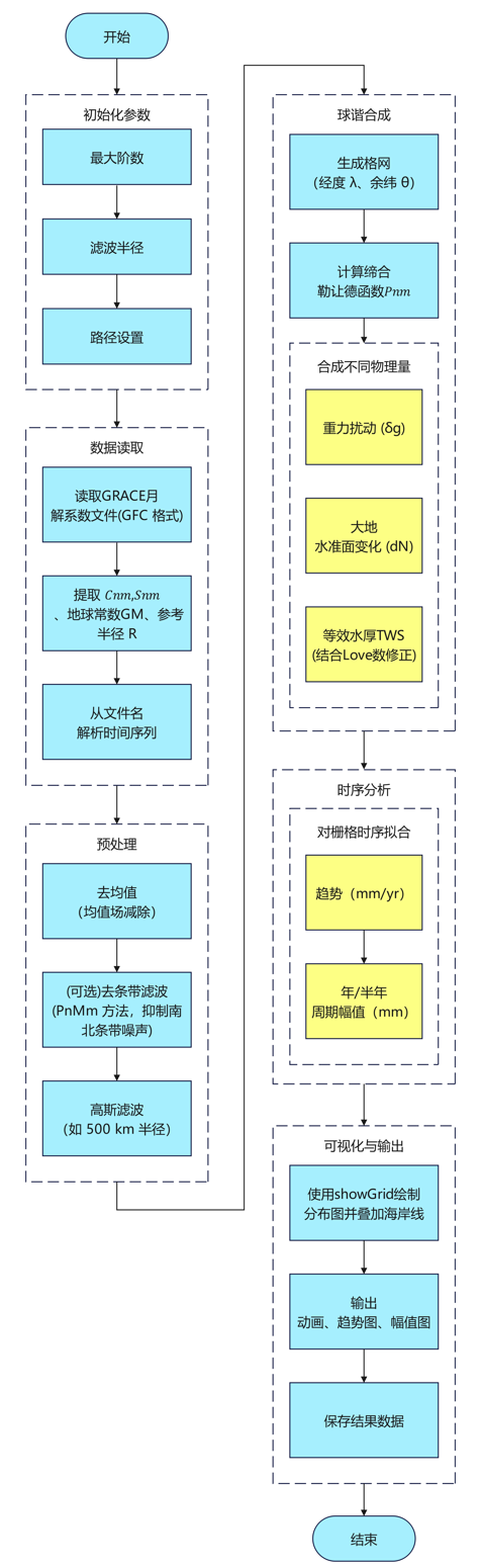 本系统基于 GRACE 卫星重力数据与球谐分析方法,实现全球总水储量变化(TWS, 等效水厚)的估算与分析。系统架构包括 数据读取、系数预处理、球谐合成和结果分析与可视化 四个模块。