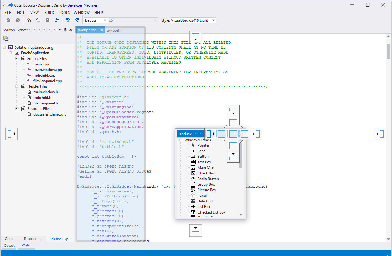 - QtitanDocking:允许您像 Visual Studio 一样为您的伟大应用程序配备可停靠面板和可停靠工具栏。黑色、白色、蓝色调色板完全支持 Visual Studio 2019 主题!