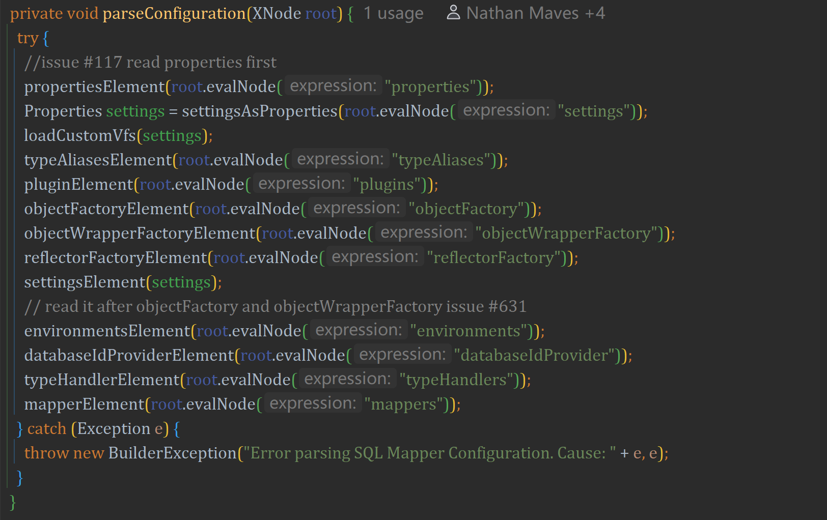 使用XMLConfigBuilder#parseConfiguration方法,逐个处理XML标签,最终构建Configuration对象。处理XML文件时使用了org.w3c.dom、org.xml.sax等依赖包。