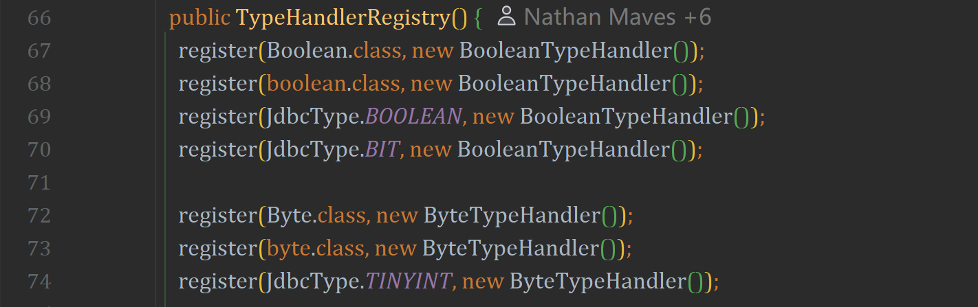 比如要将MySQL中的TINYINT处理成Java中的Byte,将使用ByteTypeHandler。