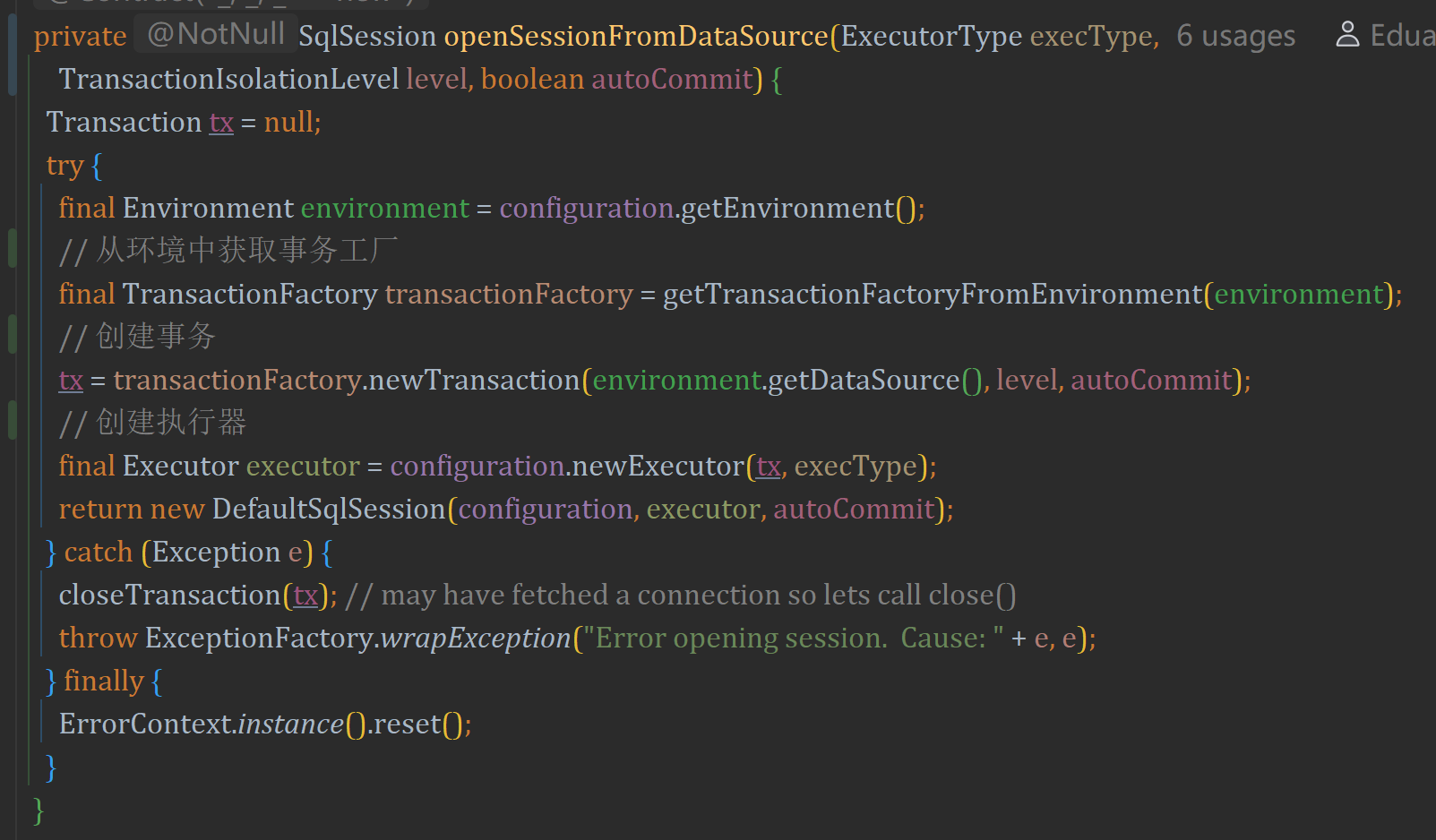 Mybatis中默认使用DefaultSqlSessionFactory。通过以下步骤,将创建一个SqlSession对象。