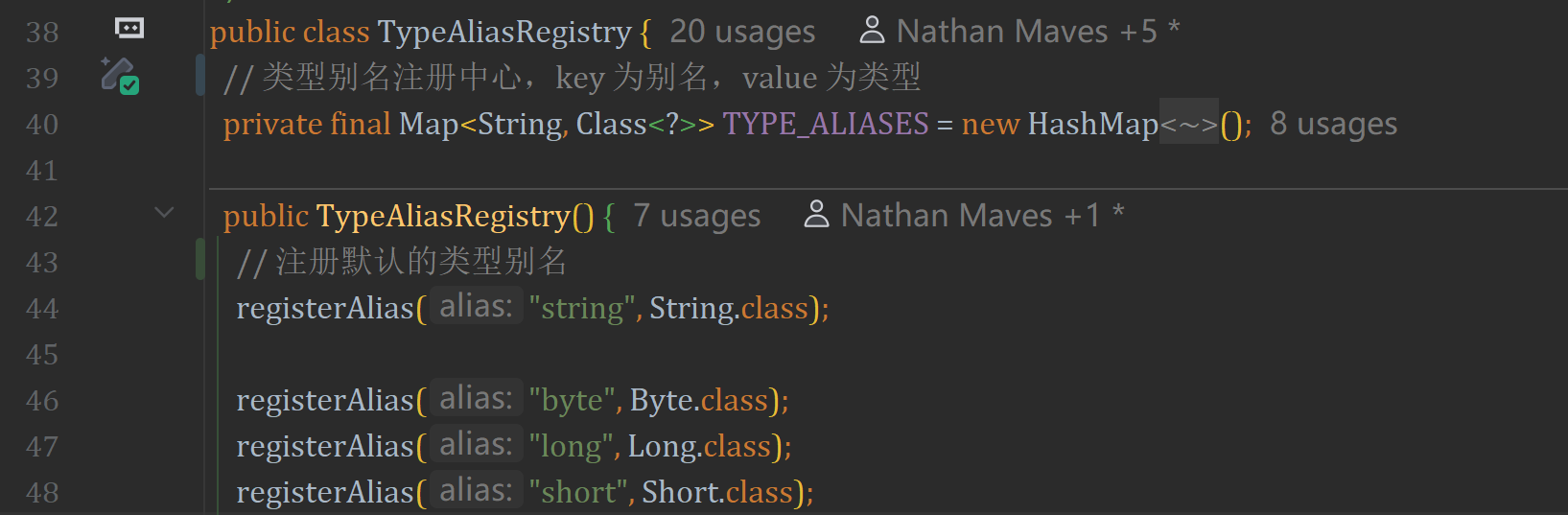 创建TypeAliasRegistry时自行注册了常用Java类型的别名。