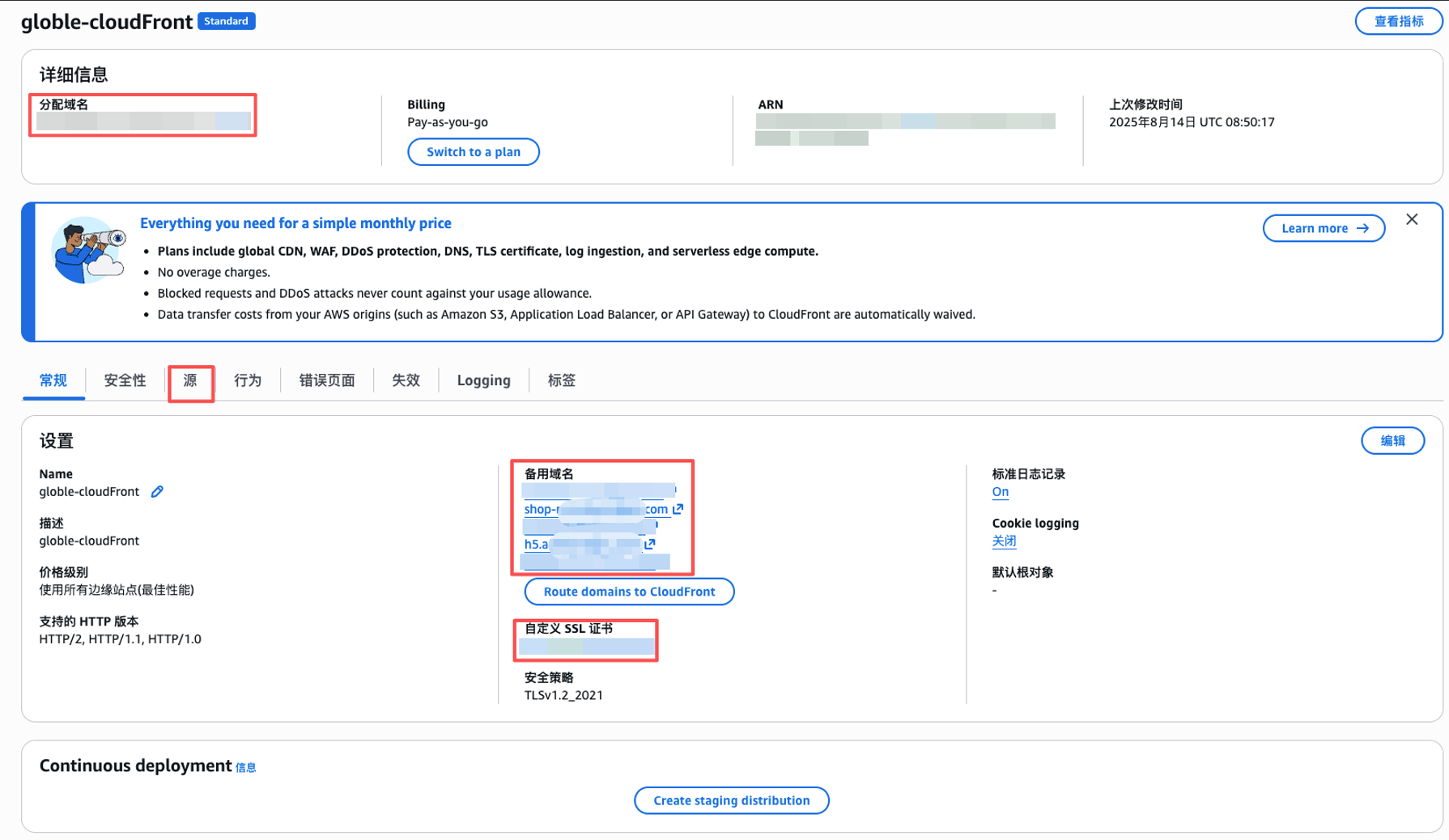 10、创建CloudFront,将需要经过CDN加速的域名添加到备用域名,添加第2步创建的证书,源添加到访问目标的DNS。成功后CloudFront会分配域名。