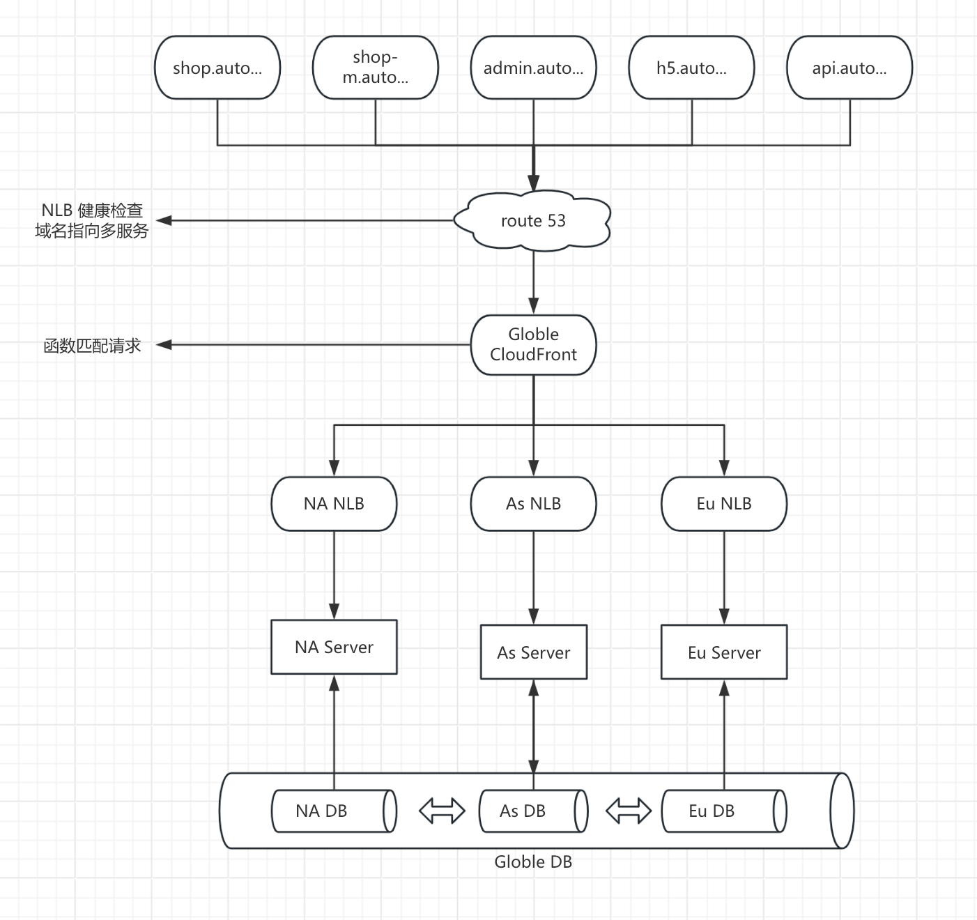 5、Aurora and RDS 数据库,Aurora 作为全球数据库,已实现主从备份,可在1s内实现全球数据同步,结合Route 53的短域名实现读写分离。