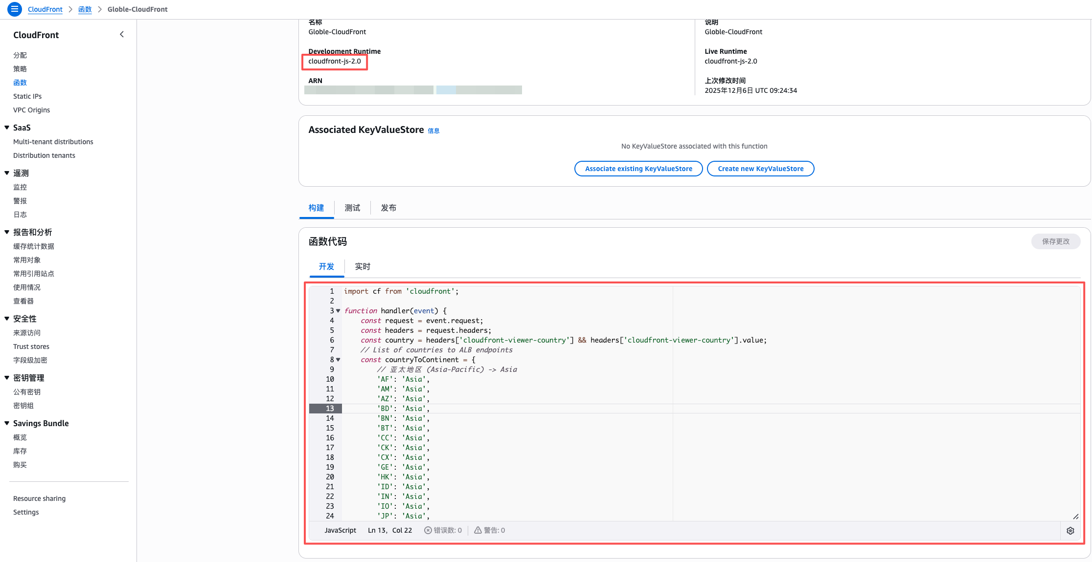 14、在CloudFront创建函数,将请求按照国家和地区分发到相应的服务器。