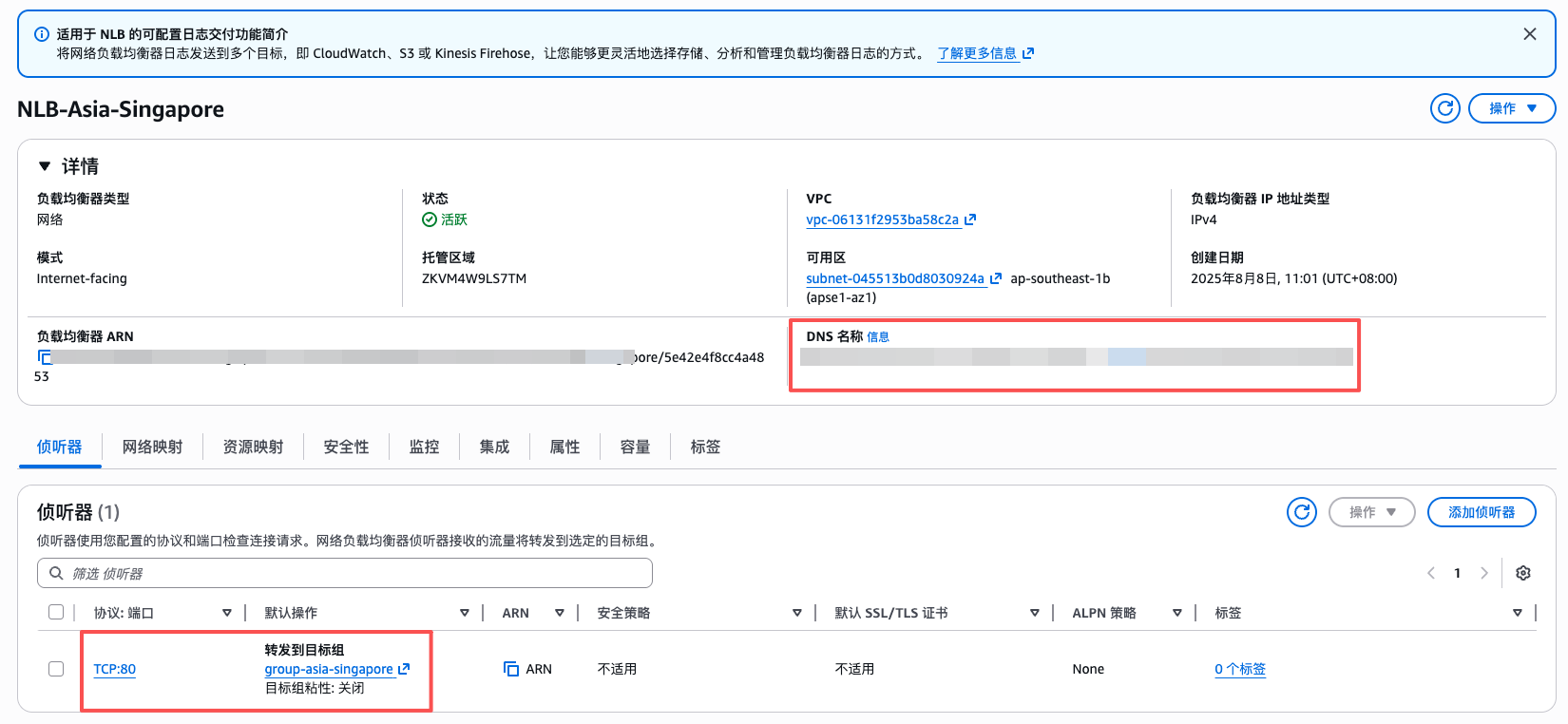这里创建NLB,添加转发到的目标组到侦听器,注意选择VPC。创建完即可通过DNS访问。