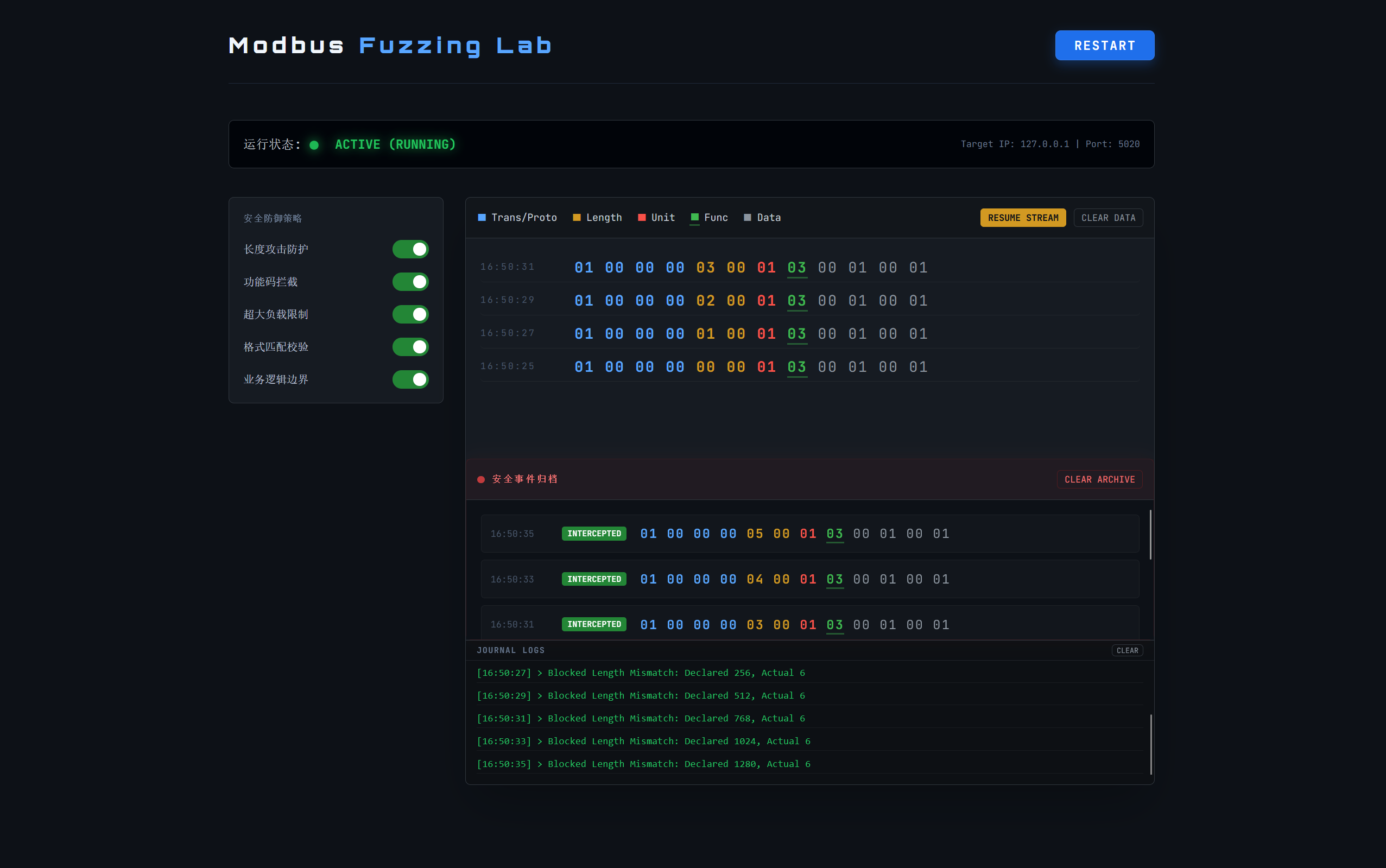 针对Modbus TCP协议中的03功能码-读取保存寄存器开发的模糊测试教学实验平台,是一个非常非常非常简陋的初级版本,用于课程作业