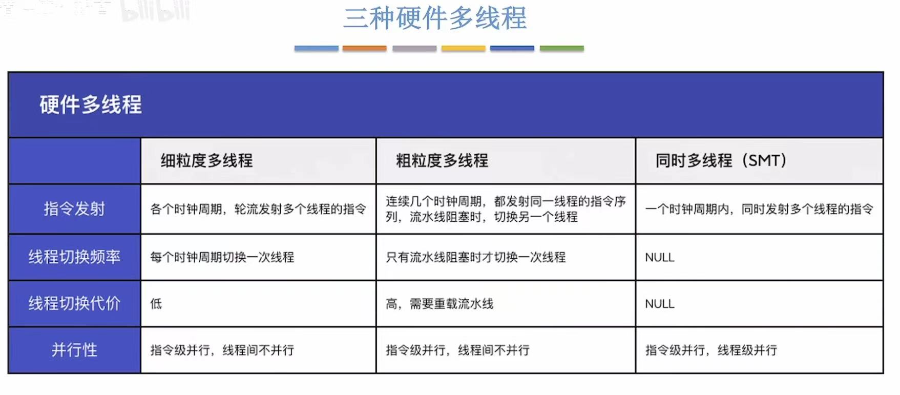 切换频率低,通常在遇到长延迟(如 cache miss)时才切换