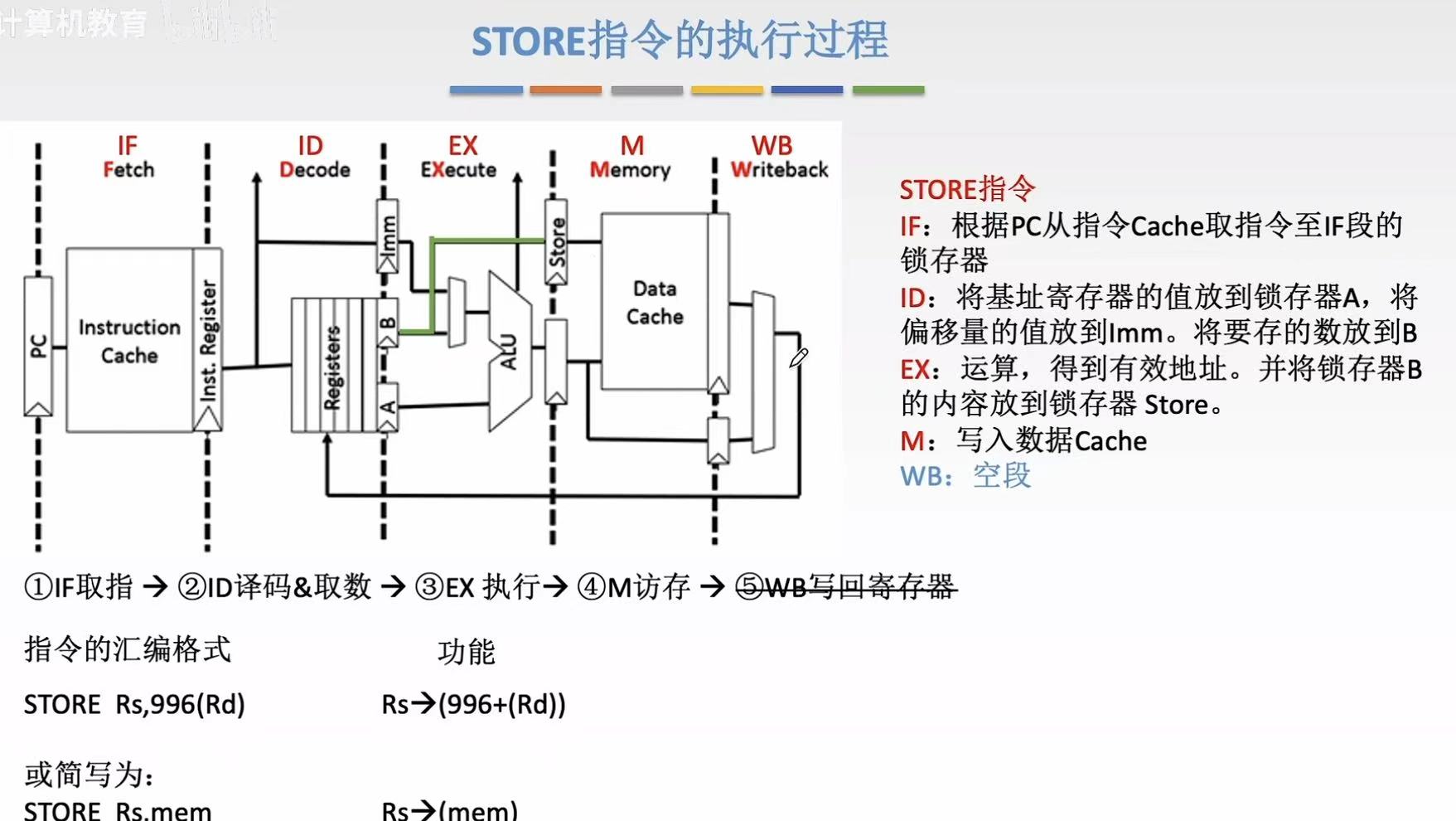 - EX-有效地址:A(Rs) + Imm(offset) → ALU → 计算出有效地址 →与 StoreData(Rt 的值)一起存入 EX/M 锁存器