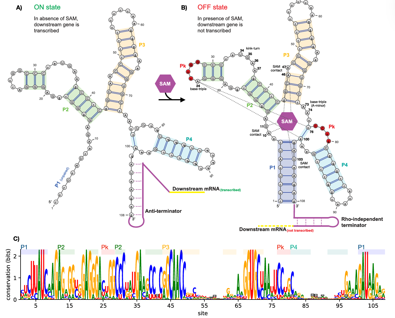 结合代谢物后(OFF 状态):适配体与代谢物(如 S - 腺苷甲硫氨酸 SAM)结合,触发构象折叠,形成终止子结构,阻断基因表达(如图 1)。