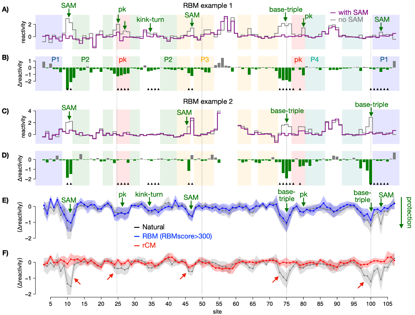 高评分的人工 RNA 序列(RBM 分数 > 300)与天然序列表现出高度相似的保护模式 ------ 结合 SAM 后,假结区(25-28 位、77-80 位)、SAM 结合位点(10 位、11 位等)的反应活性显著下降,证明其成功折叠为闭合构象;