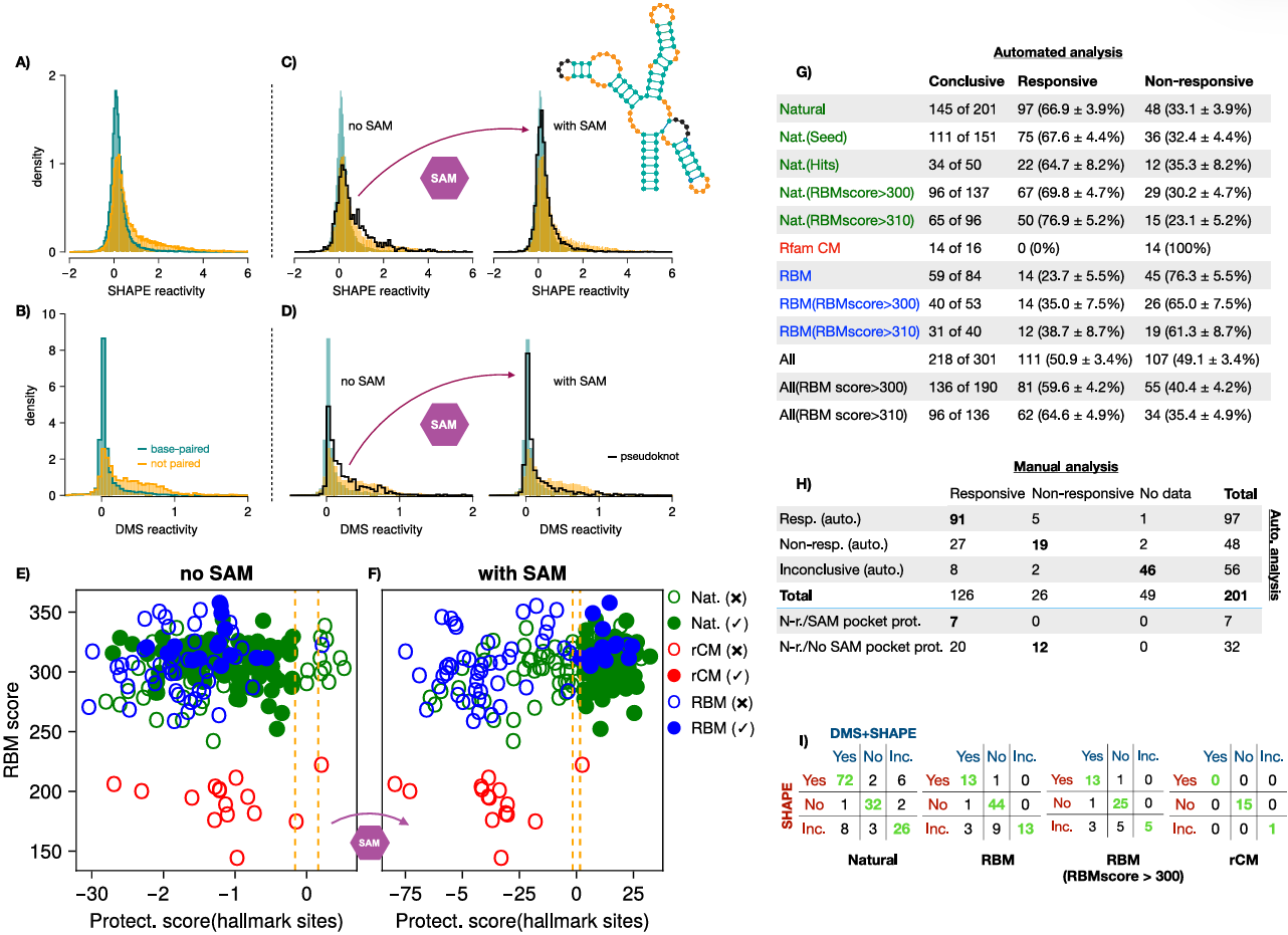 为了检验人工 RNA 的功能,团队采用两种化学探测技术(SHAPE-MaP 和 DMS),通过检测 RNA 核苷酸的反应活性变化,判断其结合代谢物后的构象转换: