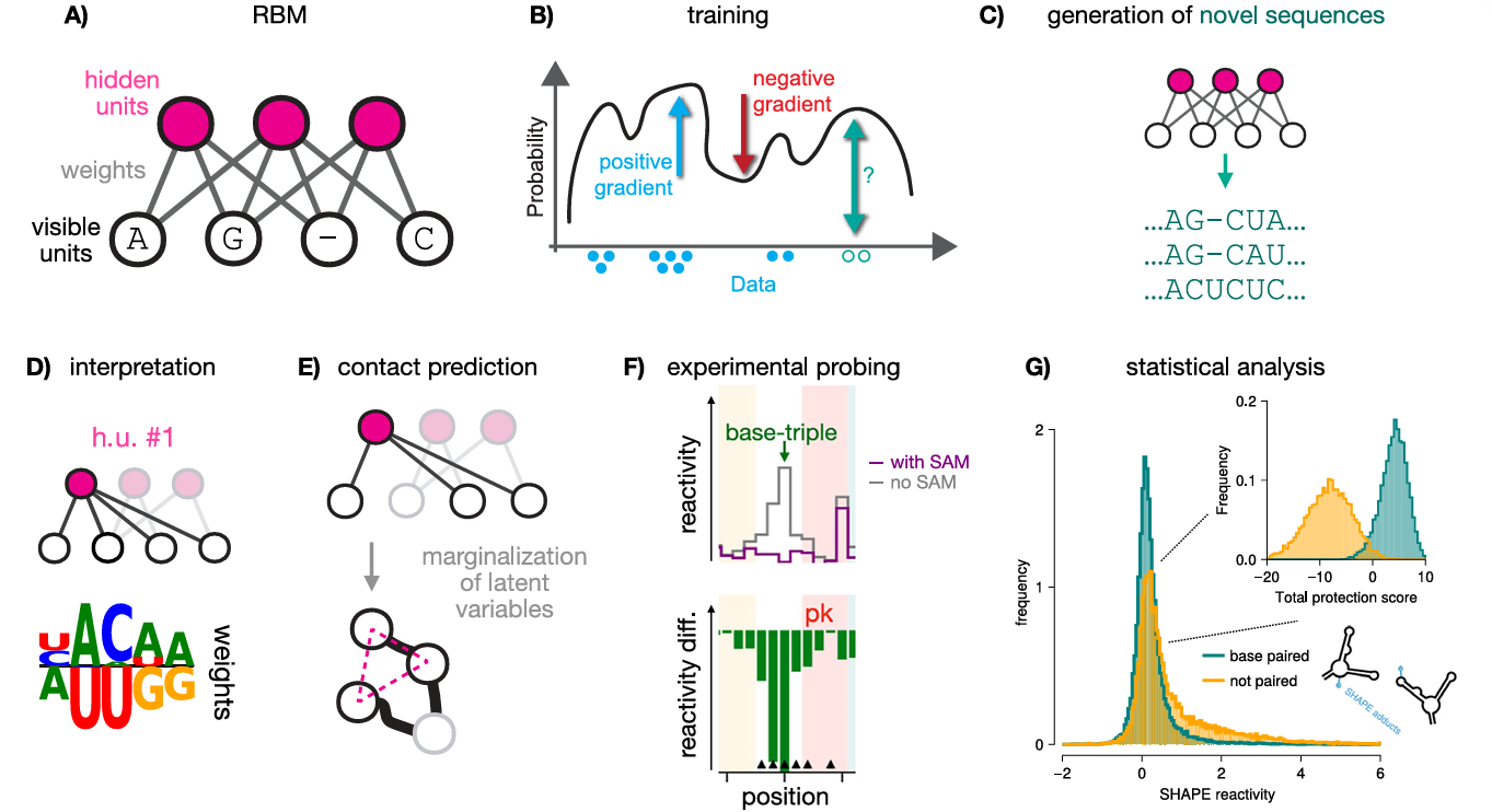 团队首先收集了 Rfam 数据库中 SAM-I 型核糖开关的同源序列,构建多序列比对(MSA)数据集。将这些序列输入 RBM 后,模型通过两个关键步骤学习: