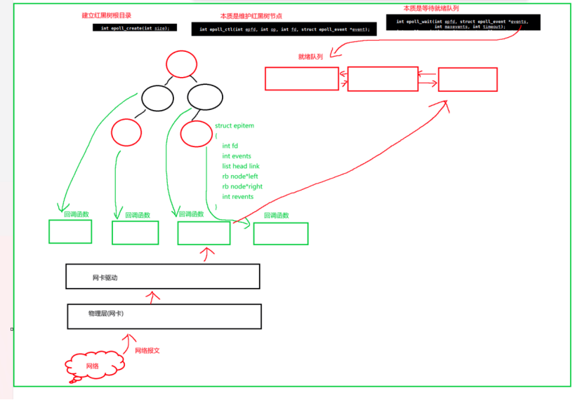 关键点:回调函数不是"检测数据",而是在socket就绪后被内核主动调用,每个监控的fd都有独立的回调函数。